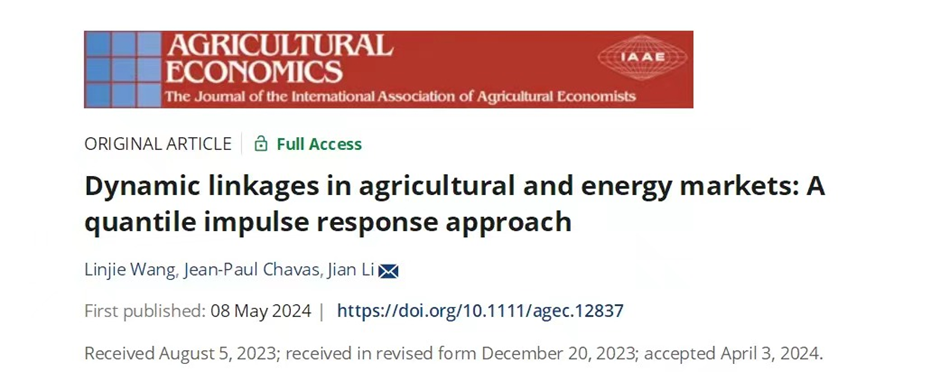 近日,beat365正版唯一入口必一博士生王林洁、李剑教授与合作者的研究论文在Agricultural Economics期刊2024年第4期发表,论文题目为“Dynamic Linkages in Agricultural and Energy Markets——A Quantile Impulse Response Approach”。 Agricultural Economics是国际农经学会会刊,主要刊发农业经济理论方法与政策研究领域的创新成果。