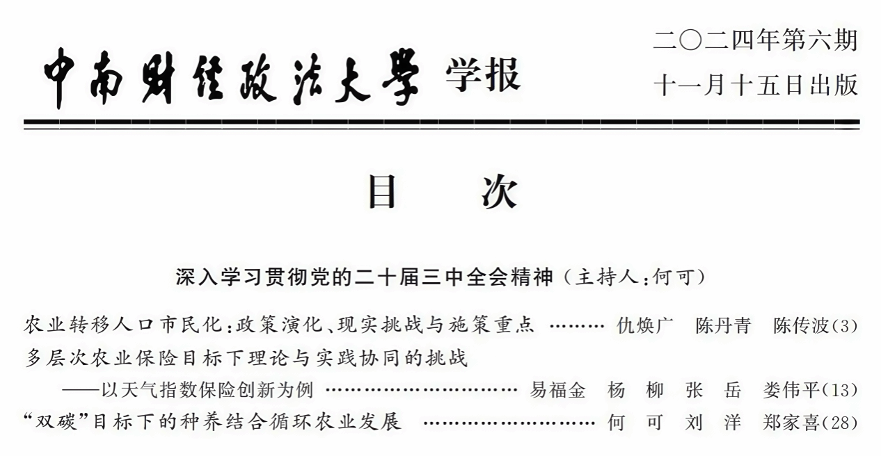为深入学习贯彻党的二十届三中全会精神,《中南财经政法大学学报》联合beat365正版唯一入口必一农业绿色低碳发展实验室,特邀教育部“青年长江学者”、实验室主任何可教授主持“深入学习贯彻二十届三中全会精神”专题,约请辽宁大学副校长、教育部“长江学者”特聘教授仇焕广教授,以及国家“万人计划”哲学社会科学领军人才、浙江大学农业风险管理与安全发展研究中心主任易福金教授,共同探讨新时代“三农”工作的重点与发展方向。相关研究成果已发表在《中南财经政法大学学报》2024年第6期。
