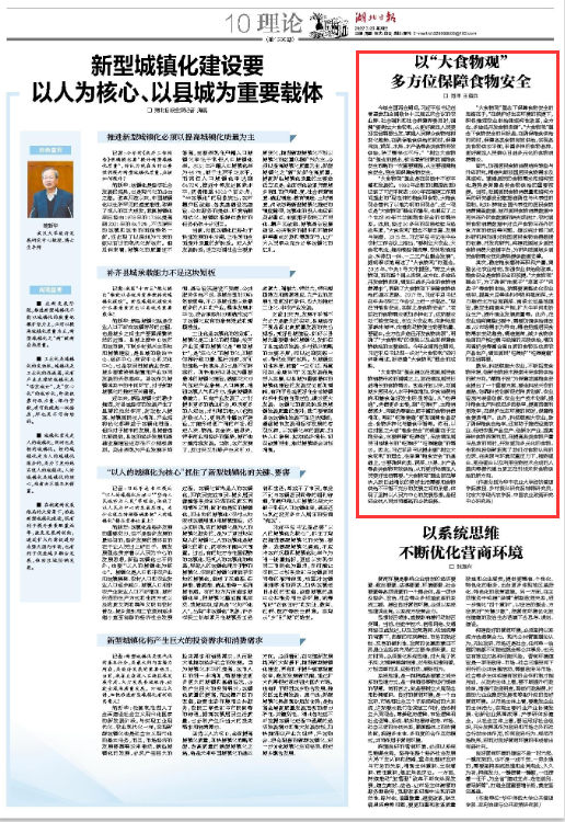 核心提示: 3月23日,《湖北日报》理论版刊发beat365官网beat365正版唯一入口必一教授、乡村振兴研究院特聘研究员闵师题为《以“大食物观”多方位保障食物安全》文章,阐述了“树立大食物观”理念的内涵与意义。