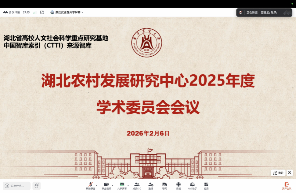 核心提示:为系统总结年度工作成效、谋划“十五五”发展方向,2月6日,湖北农村发展研究中心通过线上方式召开2025年度学术委员会会议。与会专家围绕中心建设、学科发展与服务乡村振兴等重点议题展开深入研讨。
