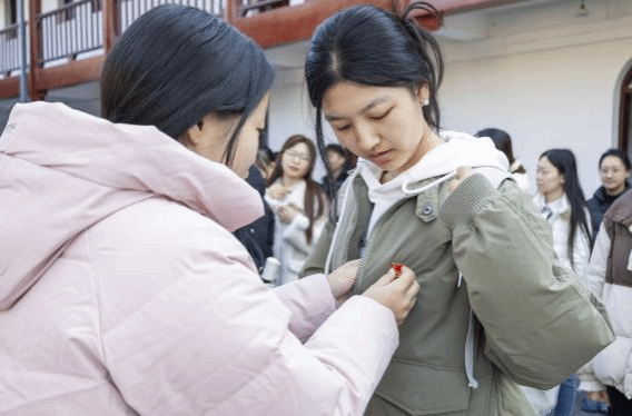 在鲜红的党旗下,各本科生党支部的老党员代表为新发展党员佩戴党员徽章,全体党员共同重温入党誓词。来自财务管理本科生党支部的周佳丽、人力资源管理本科生党支部的才日玛作为新发展党员代表发言,表达了对党组织长期以来培养和教育的感谢。她们表示,未来将继续认真学习党的路线、方针、政策,夯实理论基础,积极参与各项实践活动,努力提高为人民服务的本领。同时,她们承诺勤奋学习、刻苦钻研,敢于创新、勇担使命,真正发挥先锋模范作用。
