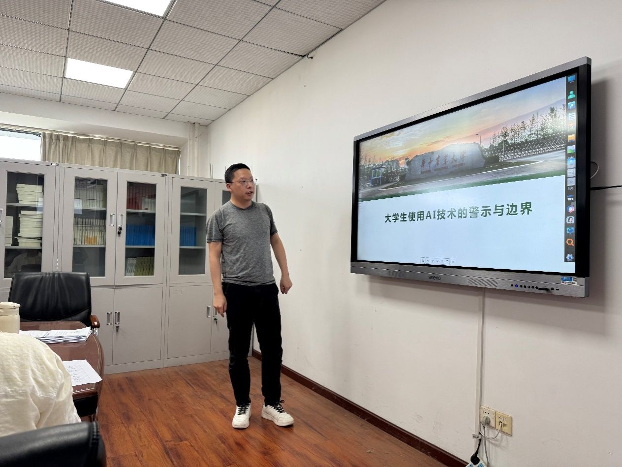 支部党员聂飞同志领学了习近平总书记关于弘扬教育家精神的重要指示精神。结合当前高等教育面临的新挑战,活动重点围绕“大学生使用AI技术的警示与边界”这一前沿议题展开专题研讨。研讨聚焦AI使用的典型风险分析和使用范围的界定原则,明确教师的引导监督责任。
