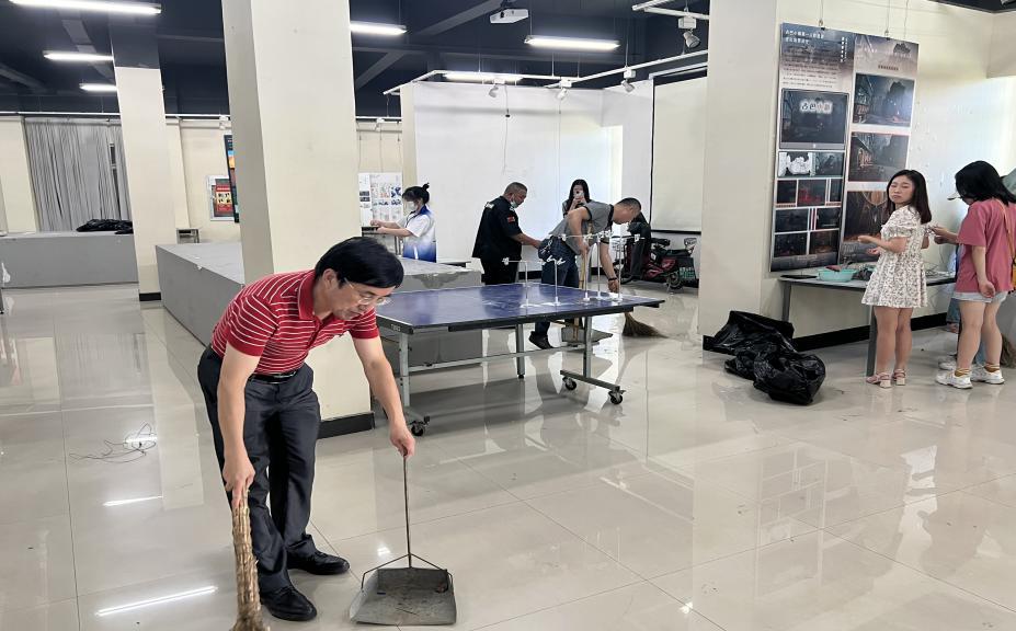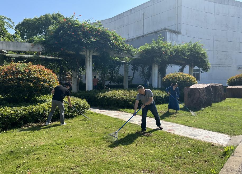 经过前期的分工分组,大家拿着不同的劳动工具,在所分配的区域内热火朝天地开始了清扫艺媒楼的活动。有的用耙子将草丛里的落叶耙出来,有的用扫把打扫艺媒楼门口的凉亭,有的打扫学院美术展厅。虽然天气炎热,师生齐动手,同参与,干劲十足,场面火热,不怕脏不怕累,将艺媒楼打扫的干干净净、焕然一新。