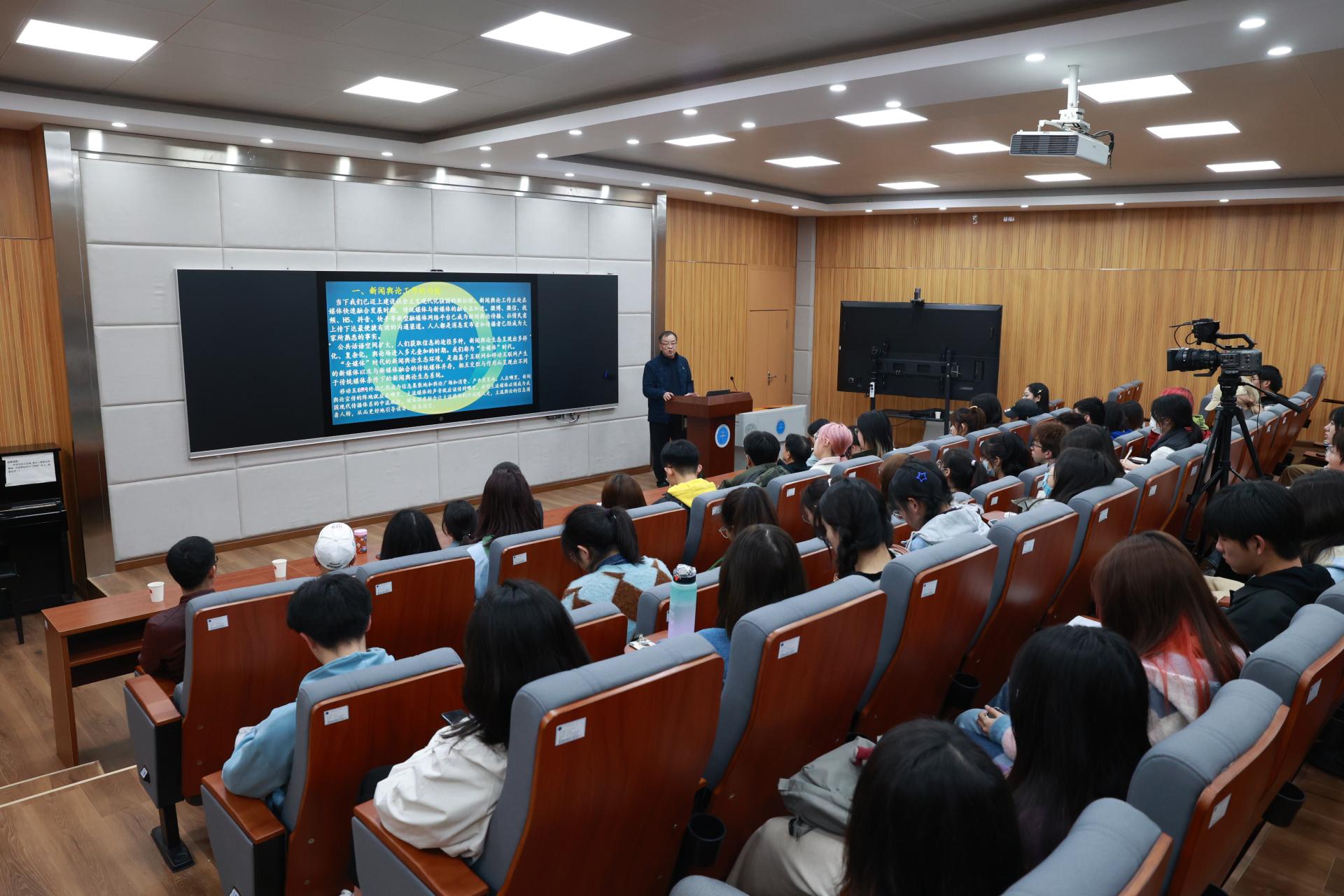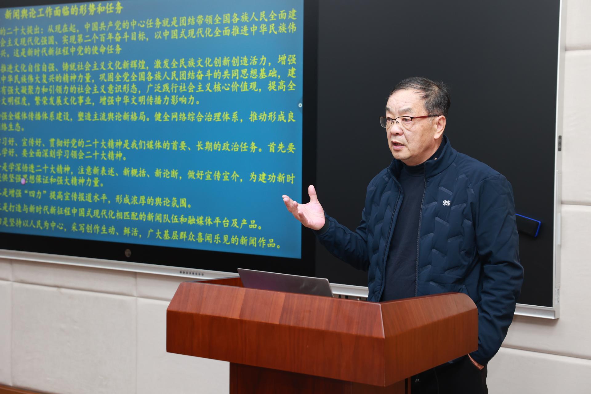 陈国栋主讲的题目是《新闻舆论工作的时度效——兼谈第31、32届中国新奖作品》。讲座中,他从新闻舆论工作的功能、融媒体时代的传播理念,新闻舆论的时度效三个方面进行讲解。他指出,伴随着传统媒体与新媒体的不断融合,当前的新闻舆论工作面临多种机遇和挑战。他结合自己从事新闻工作的经历,认为“信息跟着人走,围着人转”是当前媒体传播应当把握的风向标。同时,他强调了内容生产在融媒体传播中的至关重要性。他说,新闻舆论工作要紧跟时代,要增强对互联网规律的把握,要把握新闻传播的时间节点,要在传播效果方面有预判。讲座最后,陈国栋和师生互动交流。他希望热爱新闻传播的同学们,要多调查研究、多深入采访,要勤于思考、勤于写作,只有这样,才能推出精品力作。