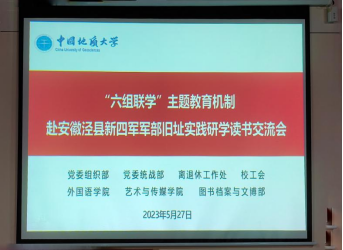遵循学校主题教育“学思想、强党性、重实践、建新功”的目标要求,学校党委组织部、党委统战部、工会、离退休工作处、图书档案与文博部、外国语学院、Beat365正版唯一官网必一等六个党委理论学习中心组联合组建原著集中学习读书班(以下简称“六组联学”读书班),于2023年5月27日在新四军军部旧址所在地安徽泾县云岭镇认真召开了读书交流会。校工会常务副主席郭秀蓉、图书档案与文博党委书记帅斌、离退休工作党委书记李门楼、图书档案与文博部长刘先国分别依次分享了《习近平著作选读》等原著的学习心得,并作了领学报告,扎扎实实地讲了一堂生动的主题教育专题党课。